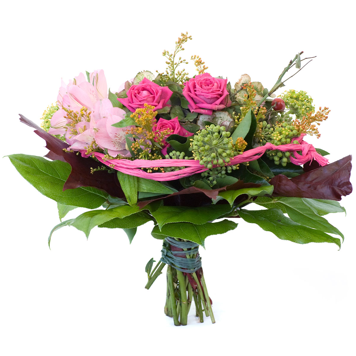 Роза одноголовая розовая, альстромерия розовая, кленовые листья, аспидистра, скиммия. Упаковка (лента, пленка, крафт, сетка, пленка матовая)