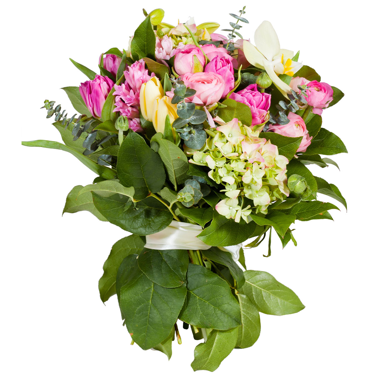Роза кустовая пионовидная розовая, гортензия розовая, тюльпан розовый и кремовый, эвкалипт, зелень. Упаковка (лента, пленка, крафт, сетка, пленка матовая)