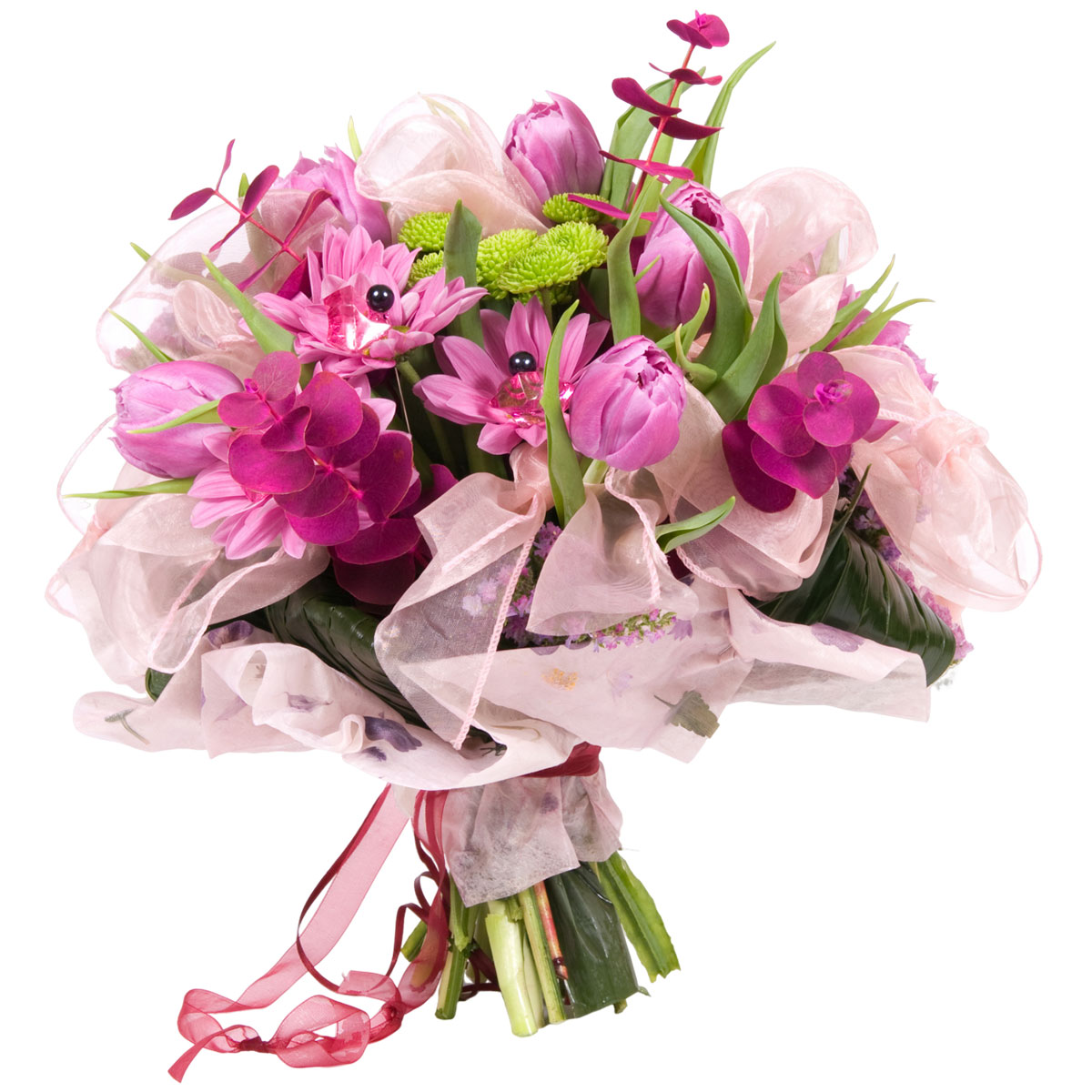 Тюльпан розовый, хризантема розовая и зеленая, аспидистра, эвкалипт, декоративные ленты и бусины. Упаковка (лента, пленка, крафт, сетка, пленка матовая)