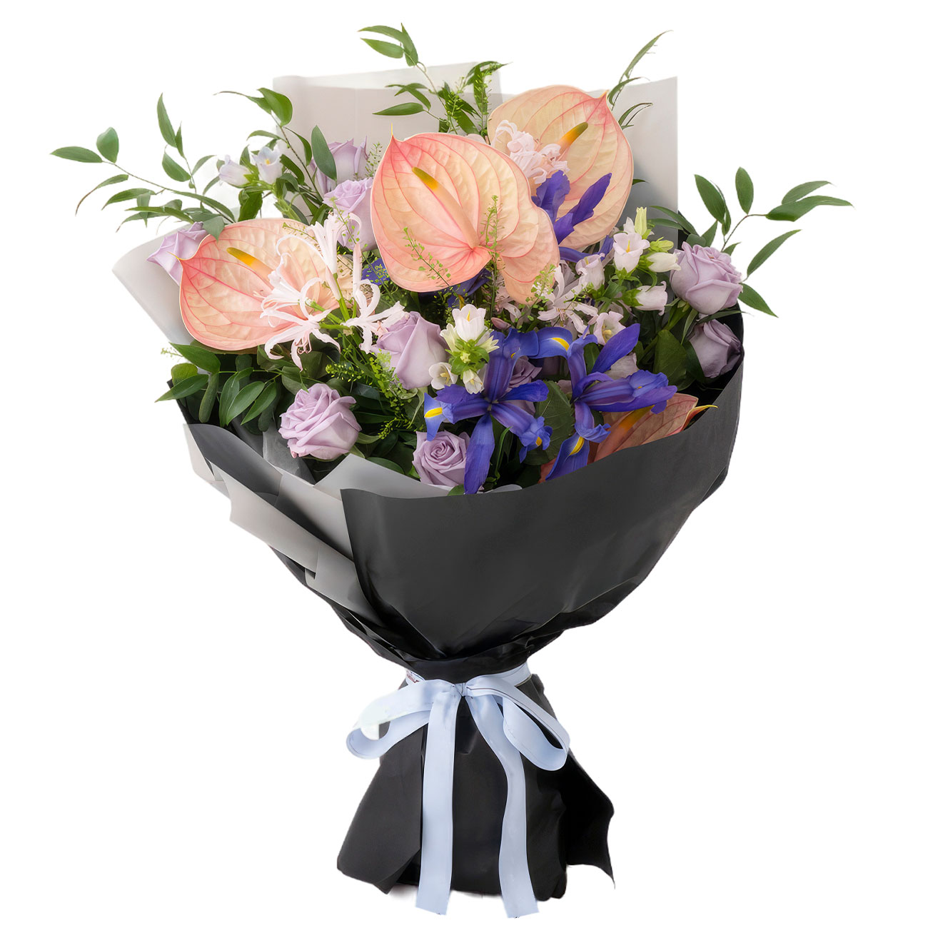 Антуриум розовый, роза кустовая бледно-фиолетовая, ирис фиолетовый голландский, колокольчик белый, зелень. Упаковка (лента, пленка, крафт, сетка, пленка матовая)