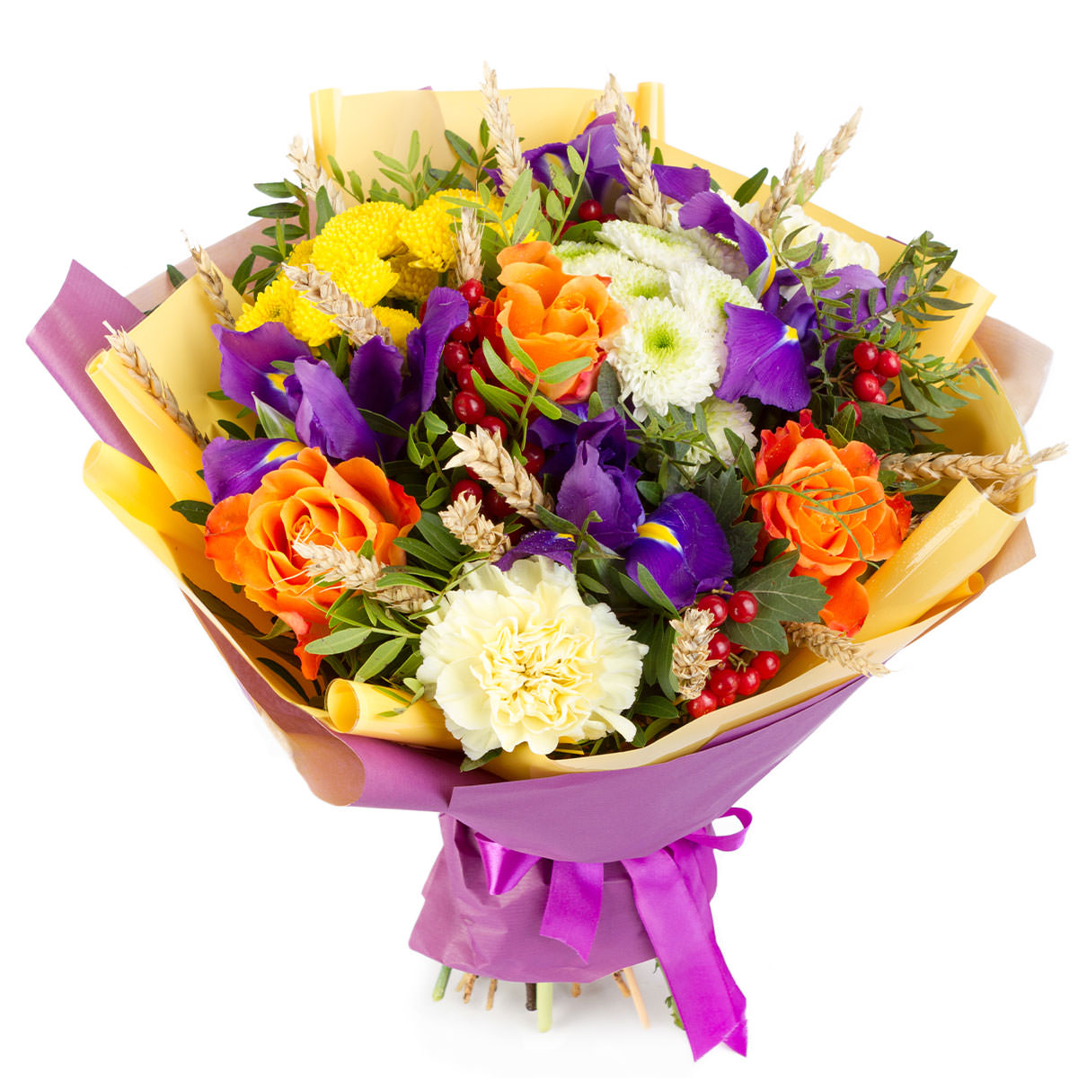 Роза одноголовая оранжевая, ирис фиолетовый, хризантема кустовая белая, гвоздика белая, гиперикум, колос, фисташка. Упаковка (лента, пленка, крафт, сетка, пленка матовая)