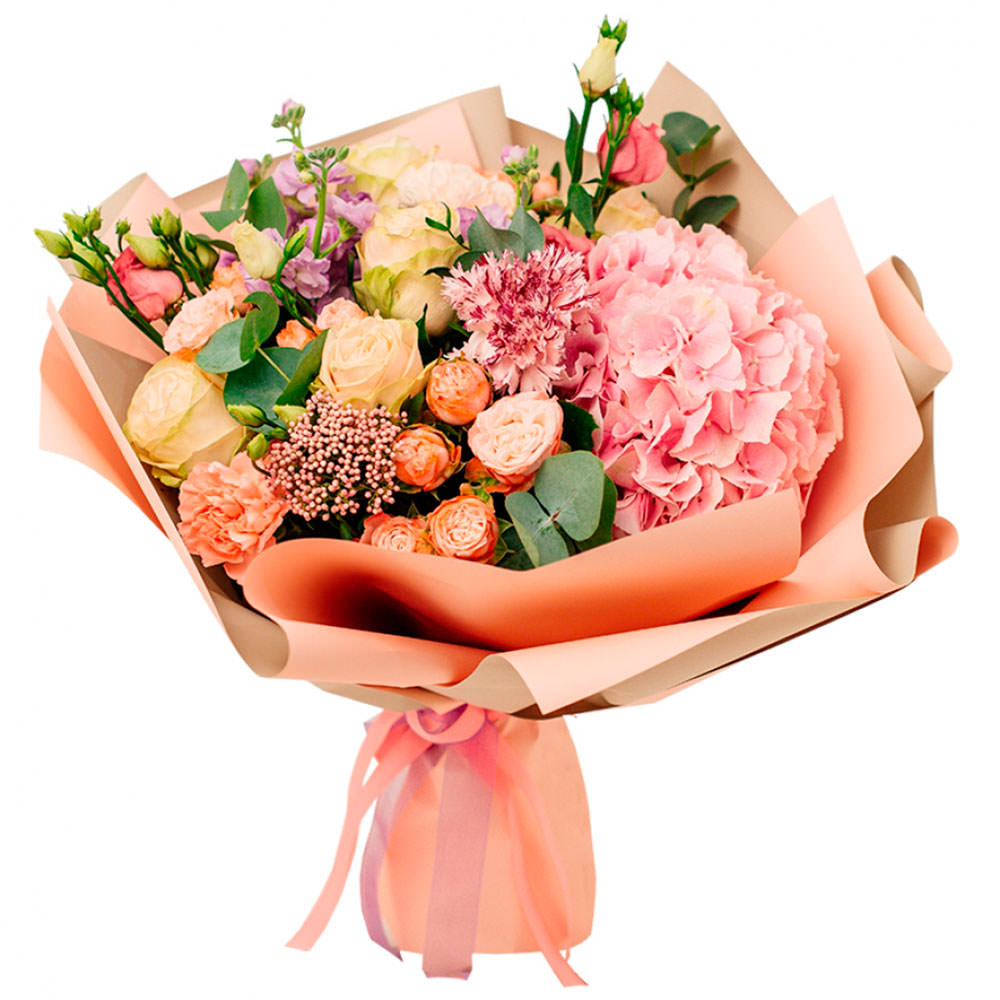 | Состав | Гвоздики, Гортензии, Кустовые розы, Маттиола, Розы, Эвкалипт |