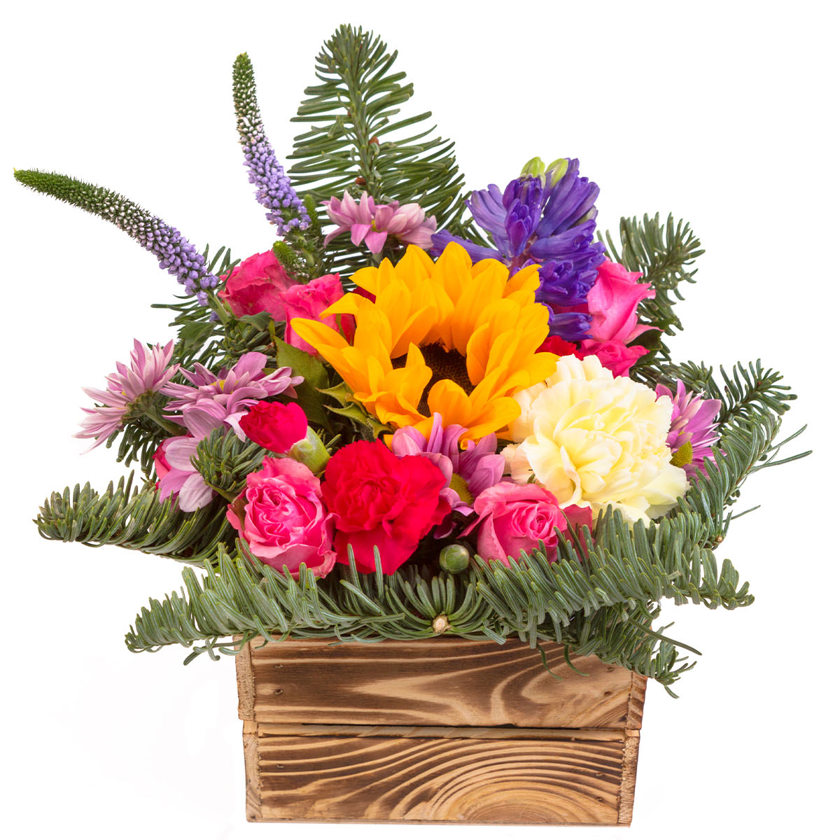 Подсолнух, гвоздика белая и красная, хризантема сиреневая, роза одноголовая розовая, вероника, пихта. Упаковка (Корзина, оазис, ящик).
