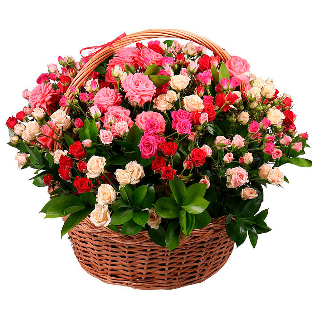 Роза кустовая микс (кремовая, розовая, красная), зелень. Упаковка (Корзина, оазис).
